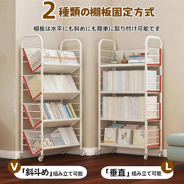 【2方向取り付けタイプ】2通りの設置方法に対応しており、棚板は水平にも斜めにも簡単に取り付け可能です。斜めに配置された収納棚は本の背表紙が一目でわかり、必要な内容をすぐに取り出せるので作業効率が大幅に向上します。操作が簡単で、お客様の多様なニーズにお応えします。