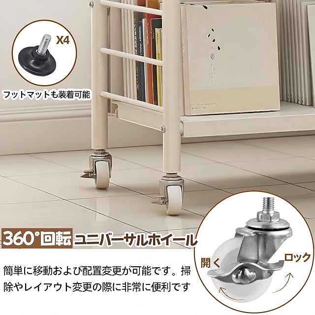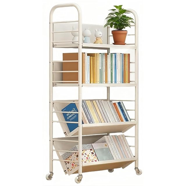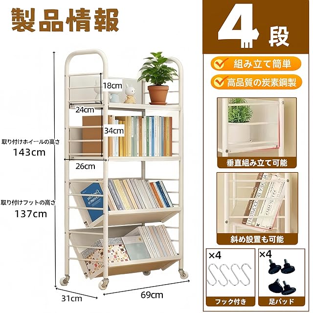 TUIYIDUO ファイルラック ファイルワゴン 本棚 4段 69x31x143cm オープンラック 360度回転キャスター付き 制動可能 スチール製 大容量 多用途 書類整理 教科書 漫画 雑誌 収納棚 斜め棚 出し入れしやすい 組み立てが簡単 日本語説明書付き (ホワイト)
