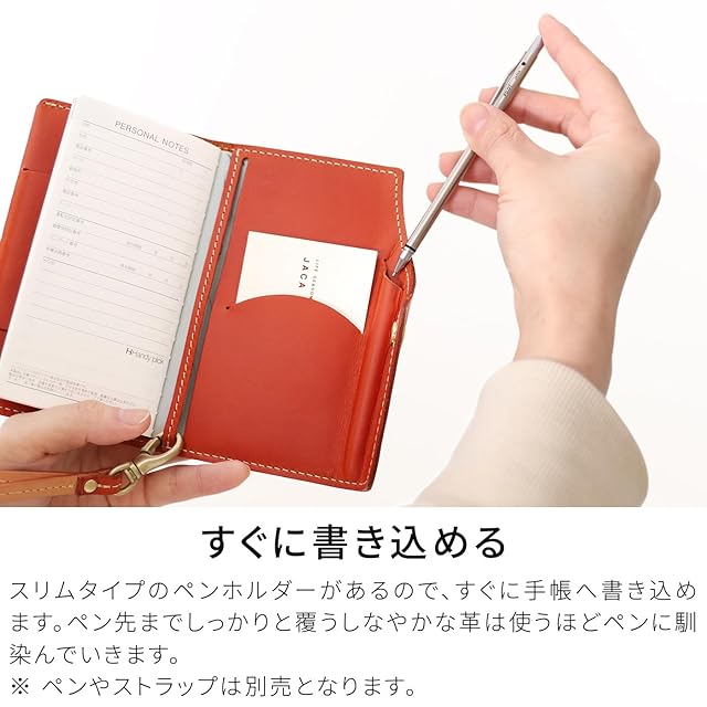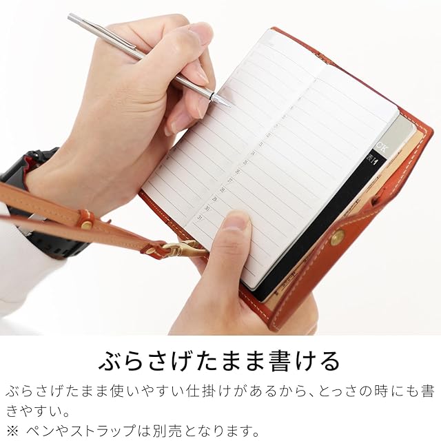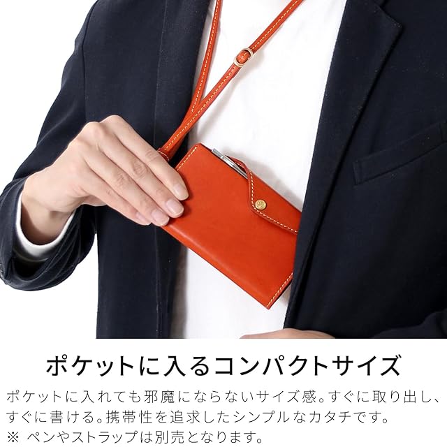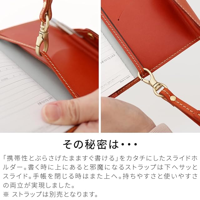 【デザイン×携帯性】日本最高峰の栃木レザーを使用した「ハンディSMALL(冊子タイプ)」は、携帯性を追求したコンパクトな手帳カバーです。ポケットに収まるサイズで、サッと取り出して書き込めます。首から下げて使える工夫(ストラップ別売)や、書きやすいスライドホルダー機構が特徴。ペンホルダーやカードポケット、しおり兼付箋スペースなど、機能も充実しています。別売りのストラップで、さらに便利に持ち運び可能です。