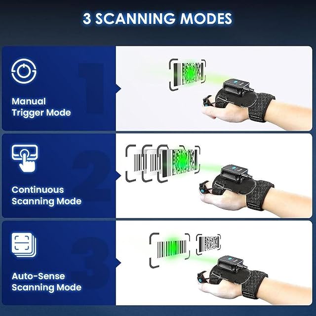 3つのスキャンモード:ウェアラブルグローブバーコードスキャナーには、手動トリガーモードだけでなく、連続スキャンモードと自動検知モードもあります。 2 つの非手動トリガー モードは、高周波スキャンに適しています。