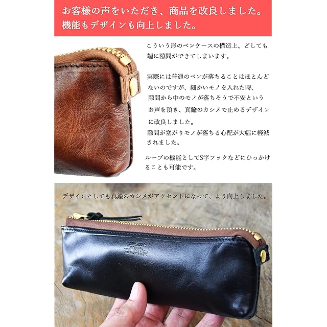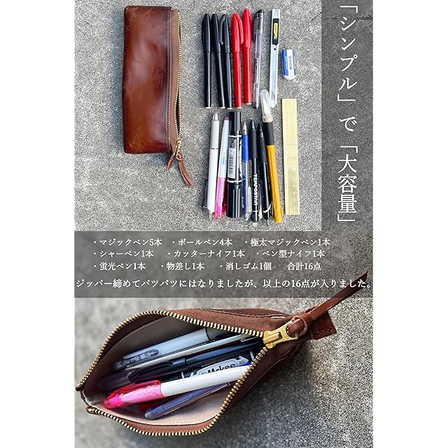 ✅素材にこだわり、本体には革(栃木レザー)を使い、裏地には帆布、金具は真鍮のUNIVERSALジッパーを採用し、経年変化を楽しんでいただくペンケースとなります。長くご使用いただき雰囲気のあるペンケースに育ててください。※ジッパーの滑りがスムーズでない時は蝋(ローソク)を塗ってください。滑りが良くなります。