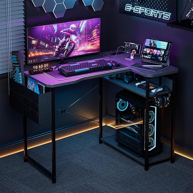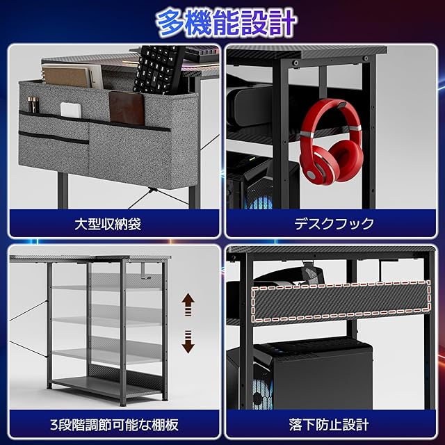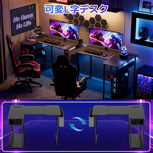 Acrolix ゲーミングデスク L字 左右入替OK 収納バッグ付き コンセント付き カーボン調天板 奥行70cm 幅100 cm 棚高さ調節可能 パソコンデスク 棚付きl字デスク ゲームデスク ワークデスク