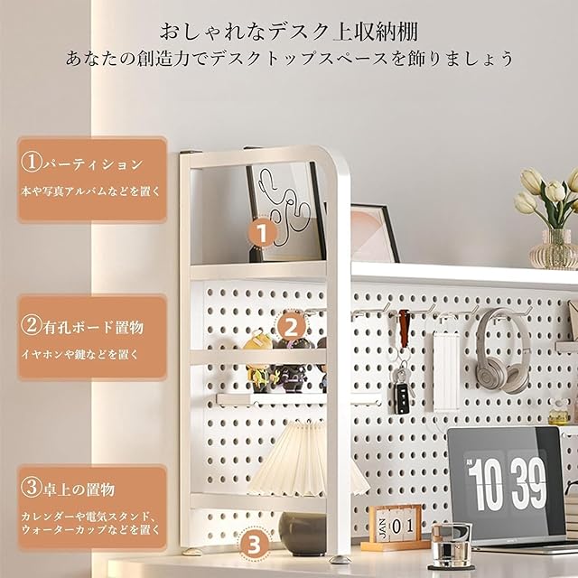 ★【DIY収納】デスク上収納ラックは革新的なデザインが有孔ボード設計により、イヤホンや鍵、小さな装飾品などを自由に掛けることができ、小物に対して優れた保管能力を持ち、大きな便利さと実用性を提供します。デスク空間も有効に活用し、個性的な机スタイルを作ることができます。
