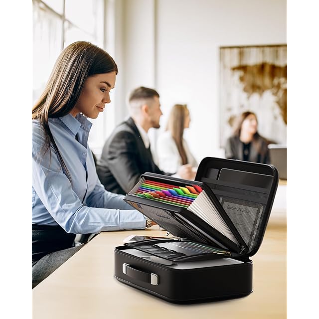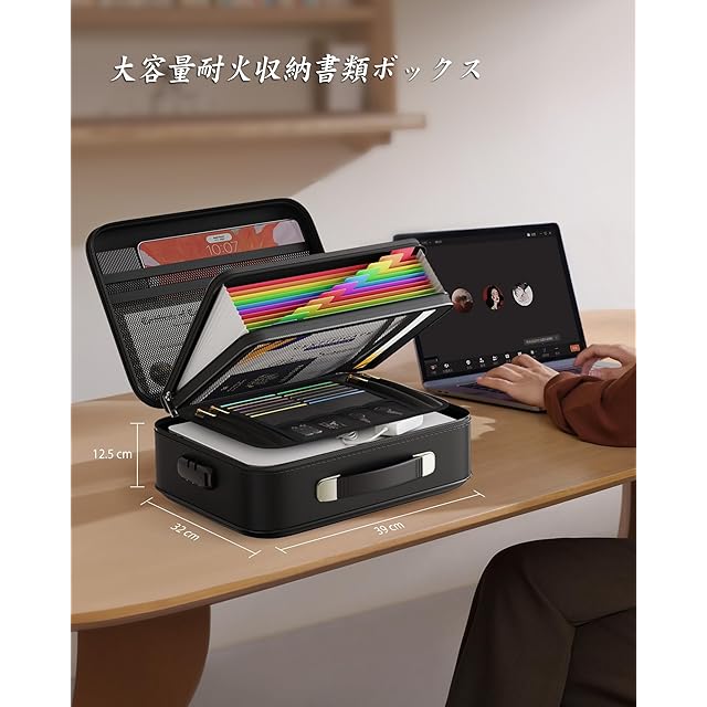 Oterri 耐火書類ボックス 硬質ケースロック付き金庫 2025年改良型 大型ファイル整理 防水保護ケース 重要書類・証明書・ノートPC・パスポート対応 (黒い、39*32*12.5cm)