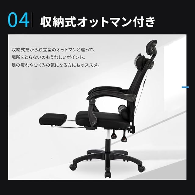 ZOOBLY オフィスチェア 疲れない デスクチェア 人間工学 収納式オットマン リクライニング 通気性 メッシュ 回転 椅子 パソコンチェア ハイバック 事務椅子 クッション付き