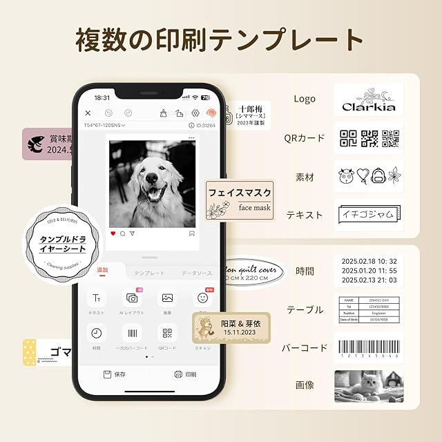 【強力な機能】App storeやGoogle Playで「NIIMBOT」を検索して、専用アプリをダウンロードしてください。「NIIMBOT」アプリにはすでに12種類言語、60類フォント、100種類なテンプレート、500以上種類なアイコンが用意されており、また定期的に新しい素材のをリリースする予定です。テキスト、QRコード、バーコード、アイコン、表、画像、線、時間、Excelインポートの機能で自由に作りましょう!