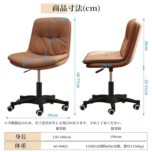 【組立簡単なチェア・商品仕様】オフィスチェアの寸法は46幅、奥36、椅子の高さ68-78cmで座面高は32-42cmです。約10cm上下昇降機能ができて様々な身長の人に応じて調整できます。このデスクチェアの重量は6.5kgで、 耐荷重が100KG可能です。また、椅子には組み立て道具、日本語説明書、補足部品がついています。誰でも15分以内にこの一体成型チェアを組み立てることができます。