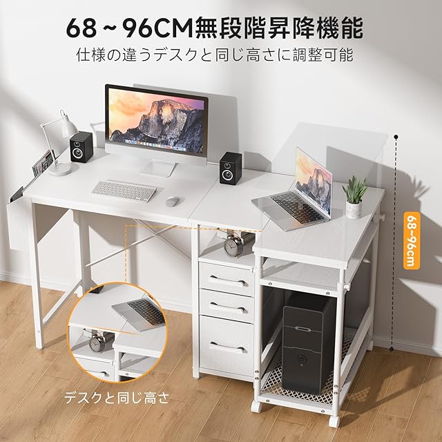 ✅【無段階昇降・デスクの拡張に対応】異なる高さの市販デスクにもかかわらず、完全に平行に設置可能です。サイドワゴンやサイドデスクの拡張にもぴったりで、68~96cmまで高さ調整が可能です。PCワゴンや収納棚としても活用できます。
