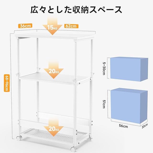 【商品仕様】(約)パソコンラックの外寸:幅62×奥行36×高さ68~96cm。内寸:(上棚)幅56×奥行30×高さ5~30cm。(下棚)幅56×奥行30×高さ52cm。 ほぼのデスクトップを収納可能です。