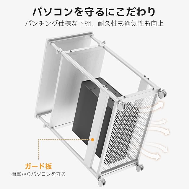 ✅【メッシュ底板&ガイド板でデスクトップを保護】パソコンワゴンの底板は金属メッシュ製で、耐荷重性と通気性に優れています。また、両側にガイド板が付いているため、パソコンの転落や足での誤っての蹴りを防止します。