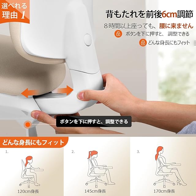 【スライド式背もたれ】背もたれを前後に調節できるので、さまざまな体型や年齢層に合わせた座り方に対応し、常に腰にフィットして腰椎を保護します。