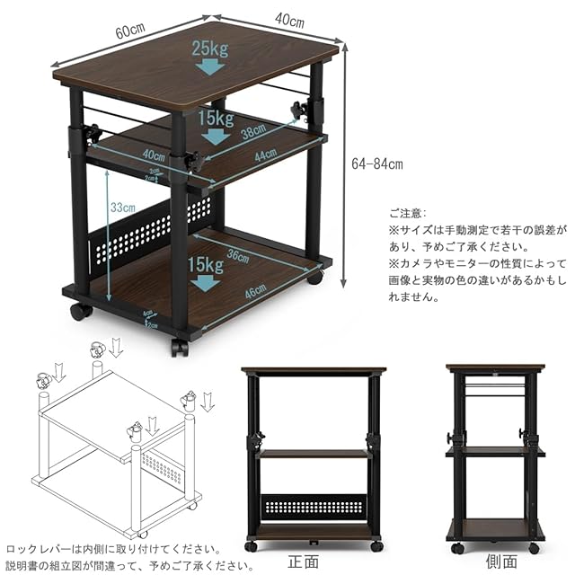 ✅【完成品サイズ】幅60×奥行40×高さ60-80cm【耐荷重】天板45kg 、中棚15kg、下棚15kg【材質】天板:メラミン化粧板/ 天板中身: パーティクルボード (天板15mm厚) フレーム:スチール(粉体塗装)