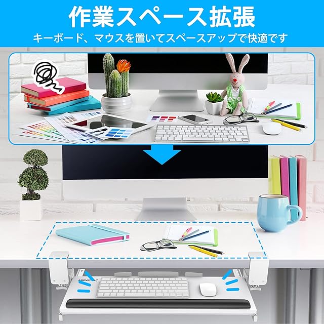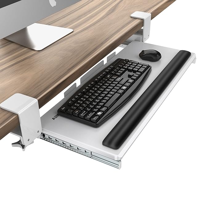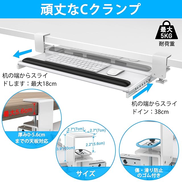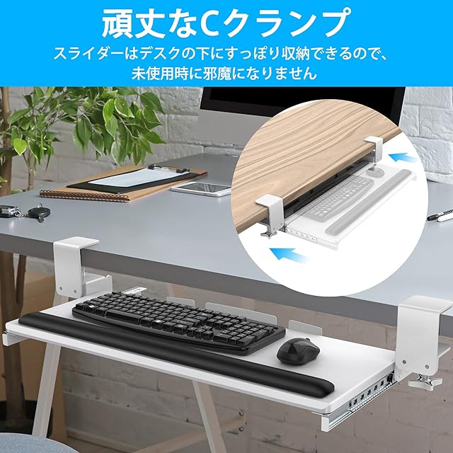 AboveTEK 大型キーボードスライダー 後付け キーボードスタンド リストレスト付き 頑丈なCクランプ式 キーボードトレイ デスクエクステンダー 肘置き台 デスク延長板 手首パッド 人間工学に基づいたデスクコンピュータ キーボード 台 キーボード デスク拡張 マウス収納可能 取り付けが簡単-白