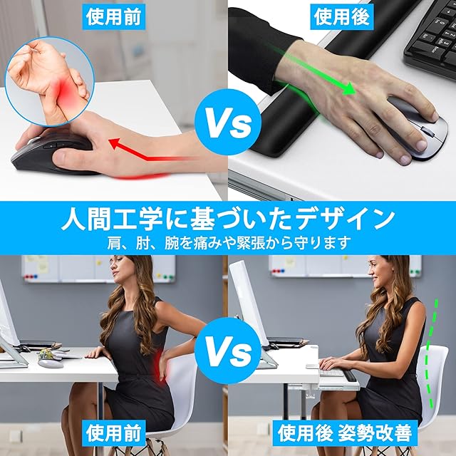 人間工学の強化: ぐらつきのないレールで、デスク下キーボードトレイをデスクの端から最大9.4インチまでスムーズに拡張でき、人間工学に基づいたセットアップを実現し、手首、首、肩へのストレスを和らげます。