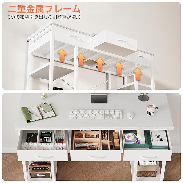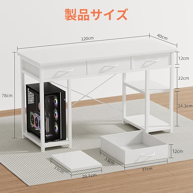 豊富な収納スペース:ホームオフィスデスクは 幅120×奥行40×高さ78cm、引き出し3つと収納棚2つを完備。布製引き出しは軽量で取り付けも簡単。両側の調整可能な棚ブラケットにより構造が安定し、書籍や文房具の収納効率を最大化。