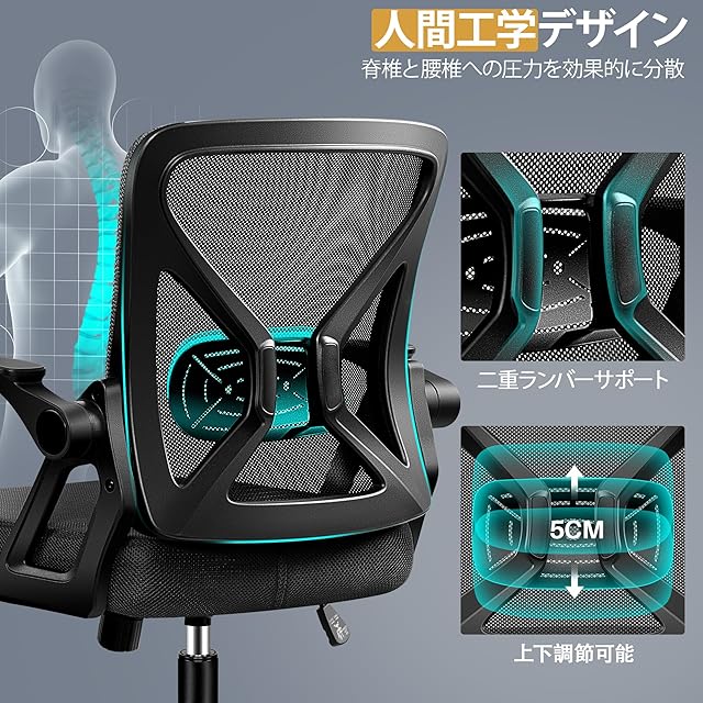 【調整可能なランバーサポート:姿勢改善で集中力持続】メッシュ背もたれは通気性抜群で、オフィスや在宅ワークでも快適な環境を提供。カーブデザインが身体の自然なラインに沿い、最大約5cm調節可能な腰椎サポートが脊柱のS字カーブを保持。腰痛予防に効果的で、生産性を維持します。