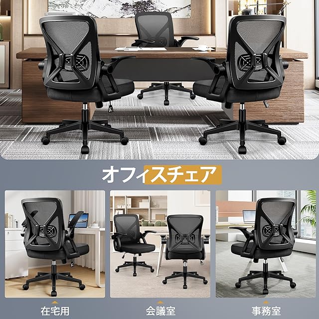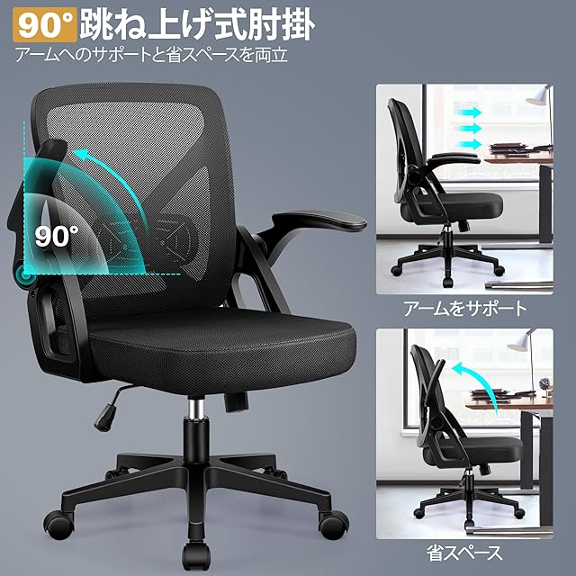FelixKing デスクチェア オフィスチェア 椅子 テレワーク 疲れない 跳ね上げ式肘掛 コンパクト 調節可能 ロッキング pc 事務椅子 360度回転 通気性メッシュ 多機能 人間工学 ランバーサポート付き パソコン ブラック FK24-4-Black
