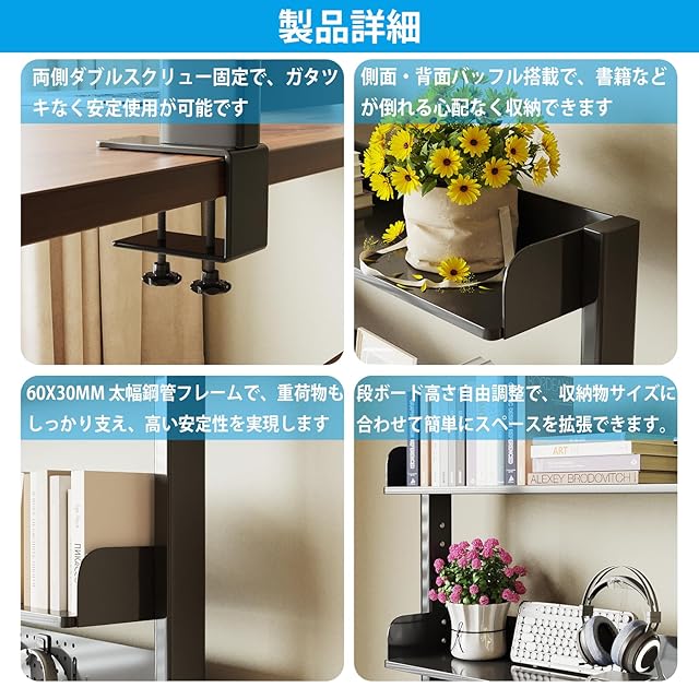 【強力な載荷能力】60x30mm の太い鋼管とダブルスクリュー固定構造により、転倒やガタツキを心配せず使用できます。15mm の厚さの密度板は、長期間の使用にも耐え、変形することなく安定した収納スペースを提供します。本製品は、重い書籍や電子機器などを収納するのにも最適です。
