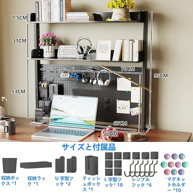 【使い勝手抜群】層板の高さは自由に調整可能で、収納する物の高さに合わせて最適なスペースを作れます。側面と背面のバッフルにより、物が落ちる心配がありません。また、ドリルボードにはマグネットホルダーが使用でき、メモや未完成のタスクをすぐに確認でき、作業効率がアップします。