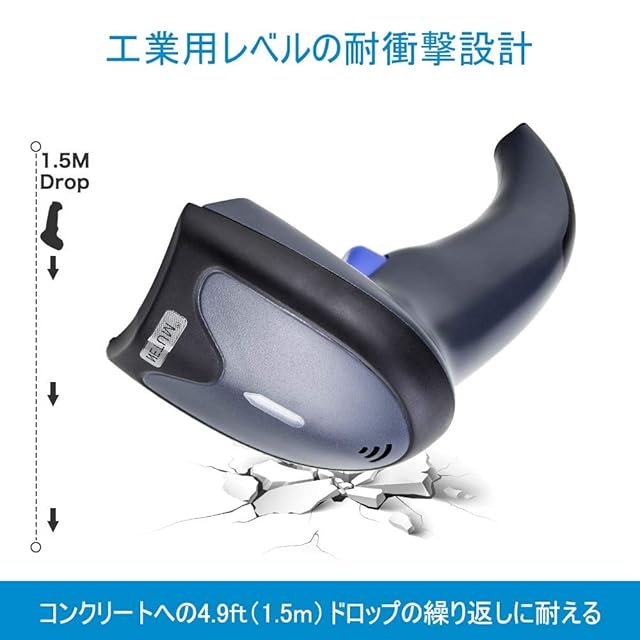 【耐衝撃性と耐久性があり】バーコードスキャナー本体は人間工学設計に適合した高品質の素材ABSを採用して、本体が129 gしかありませんが耐衝撃性と耐久性の特徴があります。バーコードリーダーは5フィート/1.5メートルの高さからコンクリート地面へ繰り返しの落下ににえ耐えられて、長持ちします。