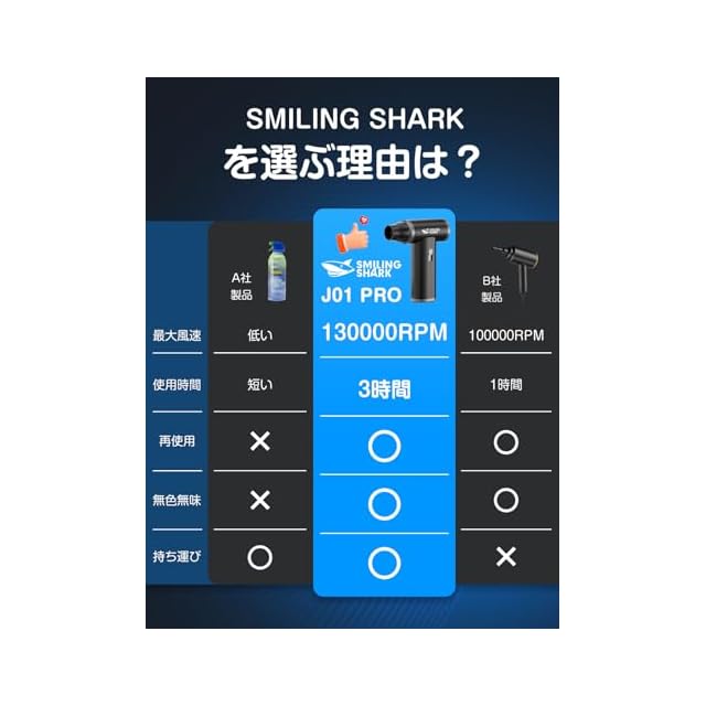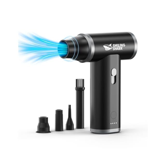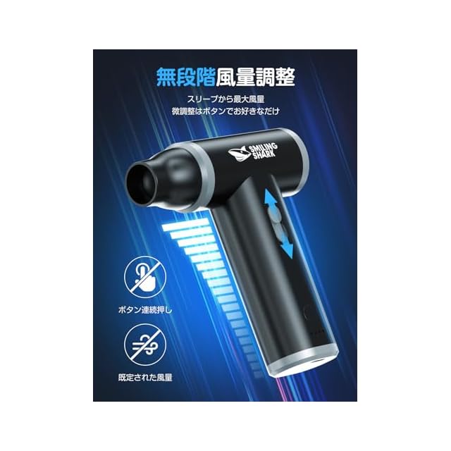 Smiling Shark 電動エアダスター, 超強力噴射 無段階風量調整 吸引機能付き 130000rpm風速 4種類ノズル付き 3時間継続使用 長時間使用 USB充電式 アルミニウム製 ガス不使用 小型 軽量 持ち運び 掃除 多用途 PC 洗車 車内掃除 エアコン掃除 隙間掃除(ブラックxグレー)