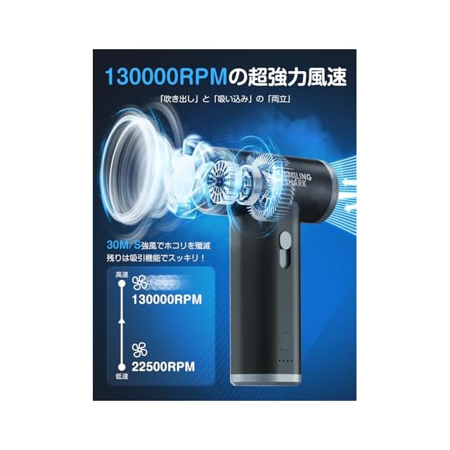 【2in1放出・吸引機能以上に30M/S最強風速】130000RPMの風速で埃や水を一気殲滅できます。PCケースやキーボード、キャンプ用品送気や火吹け、または洗車や家事などにもダブル機能で大活躍です!