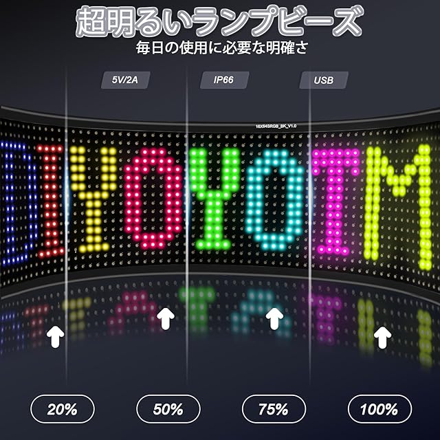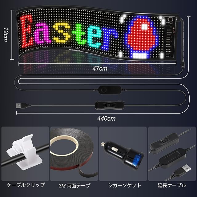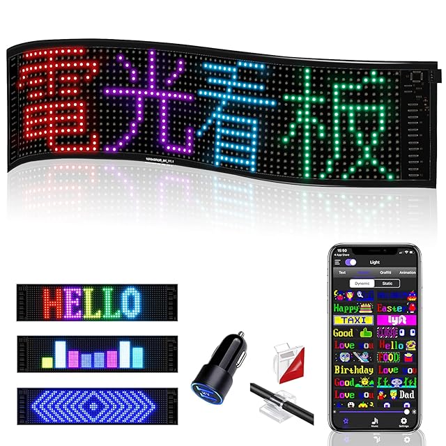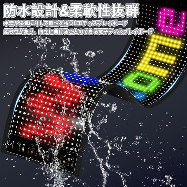 【高品質な柔軟なディスプレイボード - 曲げても貼り付けられる!】このLEDメッセージボードは、高品質な柔軟なスクリーンを備えています。曲げたり、曲面の場所に貼り付けたりすることができます。自動車のリアガラスに付けて、後方へのメッセージやチーム名のアピール、ショーウインドウの案内やイベント・セール情報などの表示等、幅広く使用可能。