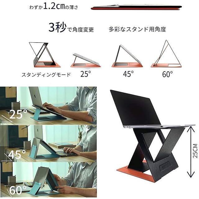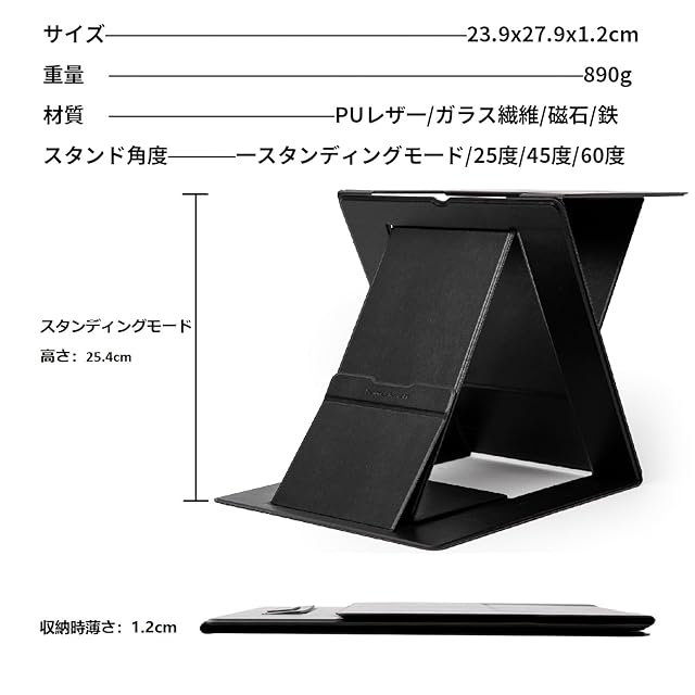 【スペック】サイズ:23.9×27.9×1.2cm、重量:890g、材質:PUレーザー/ガラス繊維/磁石/鉄。スタンド角度:25度/45度/60度/スタンディングモード。スタンディングモードの高さ:25.4cm。収納時の薄さ:1.5cm。Macbook/Macbook Air/Macbook Pro/iPad/ノートPC/タブレットなど17インチまでに対応。