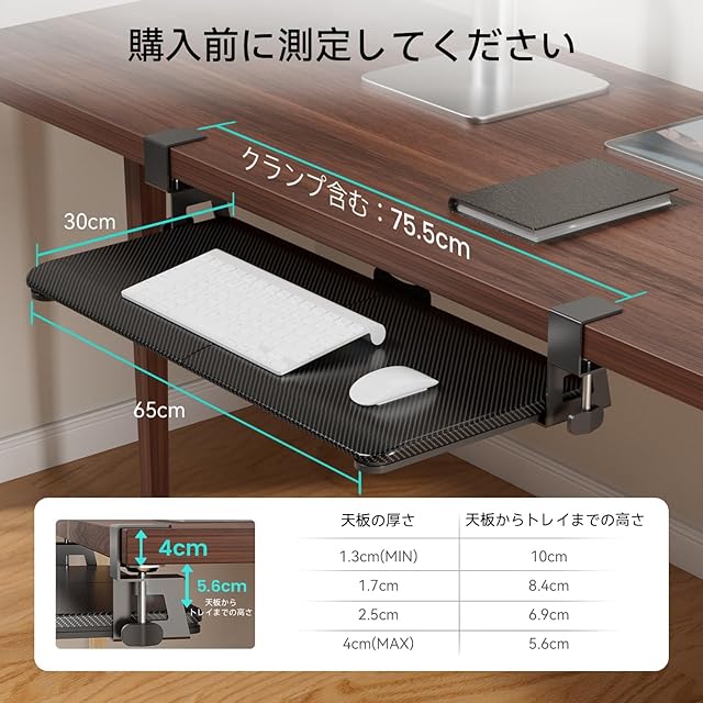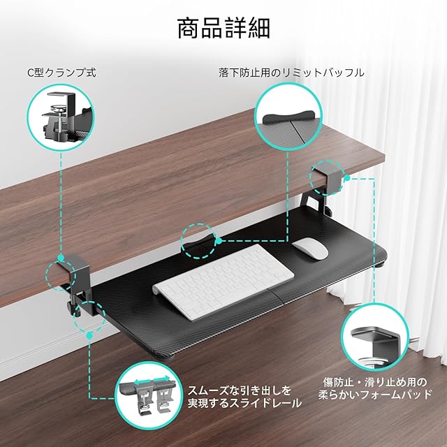 【C型クランプ式-穴あけ不要/初心者でも超簡単/子どもの安全性を守る】 キーボードが不安定だと、本当に困りますよね。調整可能なクランプは奥行きのないデスクにトレイをしっかりと固定します。また、クランプには傷防止・滑り止め用の柔らかいフォームパッド付きです。日本語の組み立て手順書が付属しており、複雑な操作はなく、ドライバー1本で取り付け可能!注意:コーナー/面取り/スカート付き/引き出し付きデスク(厚さ約40-12.7mm)には適していません。キーボードトレイの四隅に特殊な加工を施し、円弧状を採用しています。特に、小さなお子様が家で遊んでいる時の怪我を防ぐことができます。