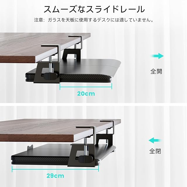 【便利なスライド式-生産性を向上させるデスクエクステンダー!】 棚部分は約762*300*95mmあるので、市販されているすべて業務/ゲーム用キーボードに完璧にフィットています。マウスやヘッドセットなどの周辺機器を置いても余裕がある広さです。不要なときは、邪魔にならないように引き出しレールで机下にすっきり収納できます。スライドレールは非常に滑らかで軽い力でスムーズに引き出すことができ、耳障りな異音もありません。キーボードとマウスを机上に置かなくていいので、広々と書類や資料を広げて作業することができます。とくにゲームプレイ時には、素早い動きに対応してマウスを動かすことができます。KD10-CBキーボードトレイを有効利用してデスク周りの環境を整え、効率的に作業しましょう。