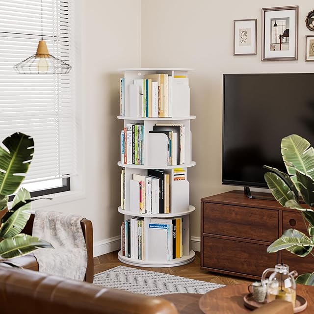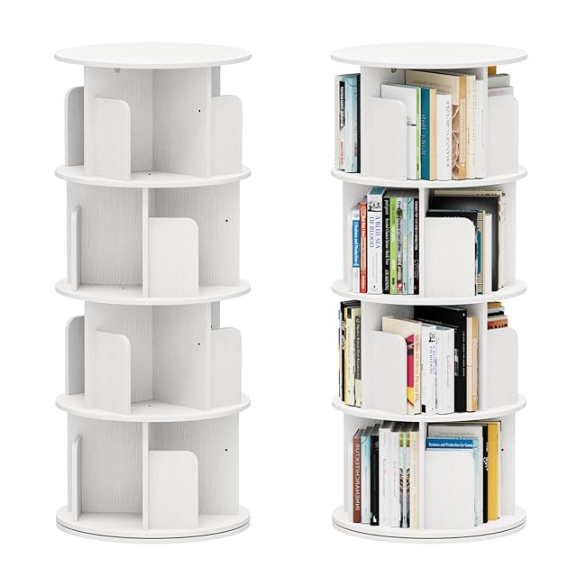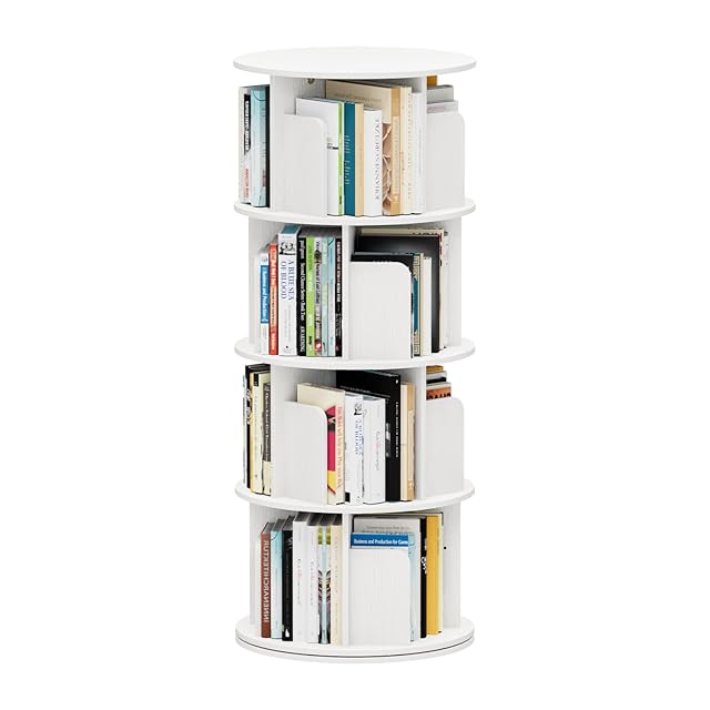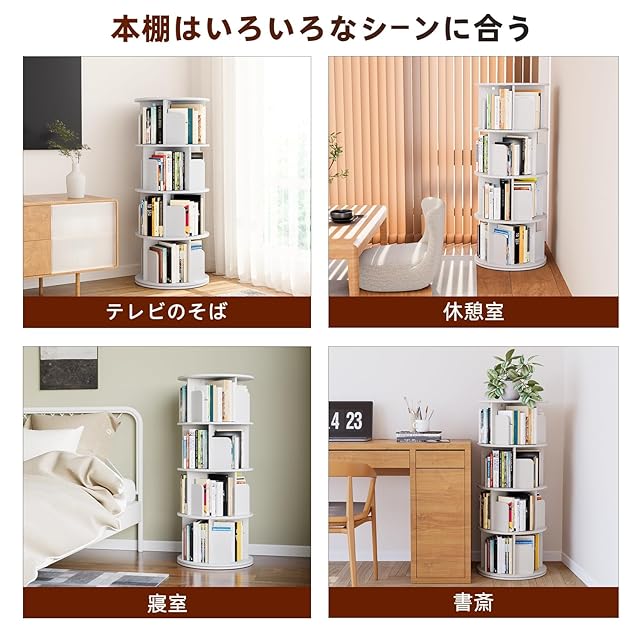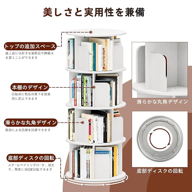 大容量:この回転式本棚は4段で、各階に4か所の収納スペースに仕切られ、本や飾り物など分類することができます。最上段にはアルバムなどの日常用品を置くこともできます