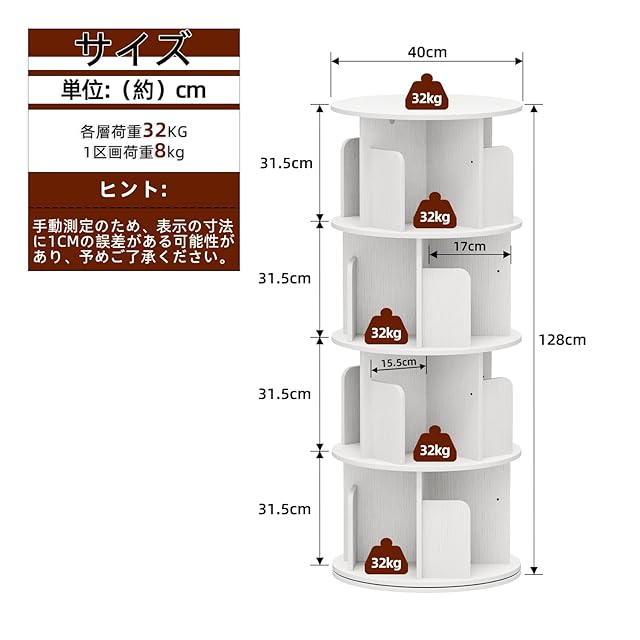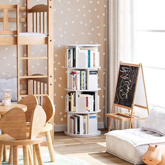 kukeimaru本棚 回転式本棚 4段 直径40CM*高さ128CM 漫画 絵本棚 子供本棚 CD棚 ラック 大容量 省スペース ホワイト