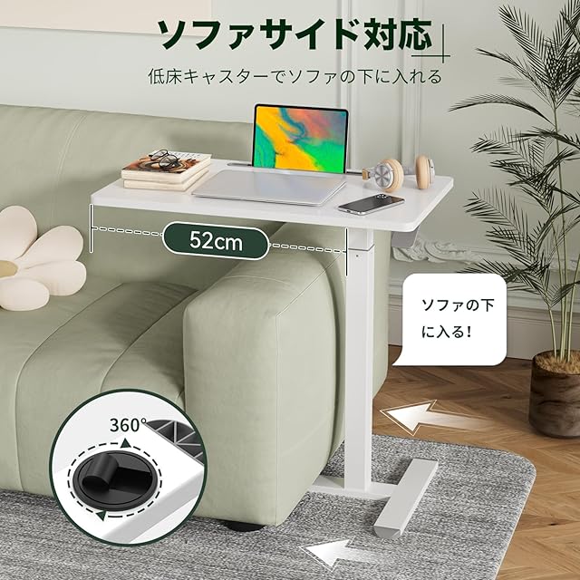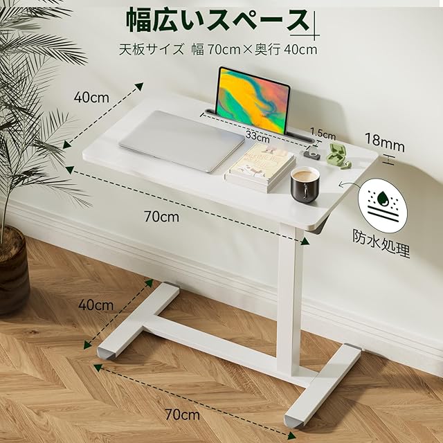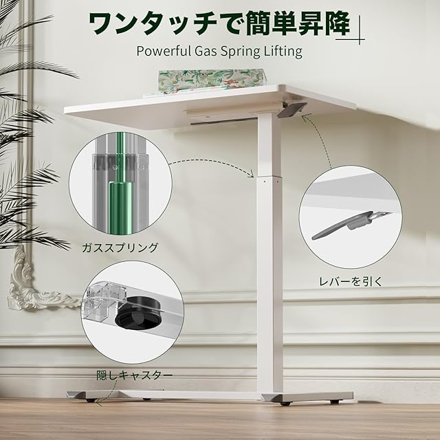 GIBBON MOUNTS 昇降式デスク 幅70cm×奥行き40cm サイドテーブル 2ステップで組立完了 スタンディングデスク Pad用溝付き パソコンデスク ガス圧 高さ調節66-107cm ベッドサイド テーブル キャスター付き ホワイト白