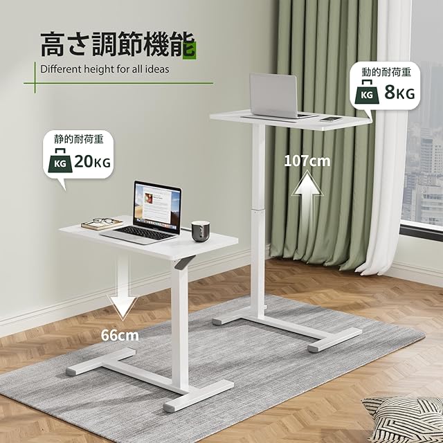 【商品仕様】丨天板サイズ:幅70cm×奥行き40cm丨高さ調節範囲:66cm~107cm丨耐荷重:8KG(昇降状態)、20KG(静止状態)丨MDF(PVCシート貼り)・高品質スチール丨18mm厚み天板で市場のほかの商品より丈夫で耐久性がよいです。重い荷物を載せても安心して使えます。昇降デスクの高さでは少し揺れる場合がありますので、予めご了承ください