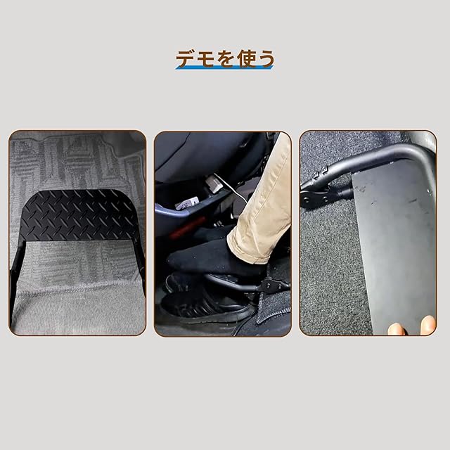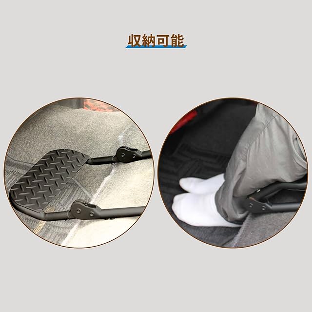 【折りたたみと収納】フットレストプラットフォームを内側に折りたたんで折りたたんだ後閉じる限り、前部のグローブボックスに干渉せず、後部のボンネットも邪魔にならずに簡単に開閉できます。 収納状態はコンパクトで乗車時の足元スペースの邪魔になりません。 助手席に座ったまま簡単に広げて収納できます。 収納時に邪魔にならず、車内のエアコンの給気にも影響を与えないので使いやすいです。