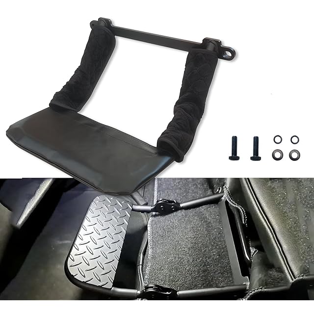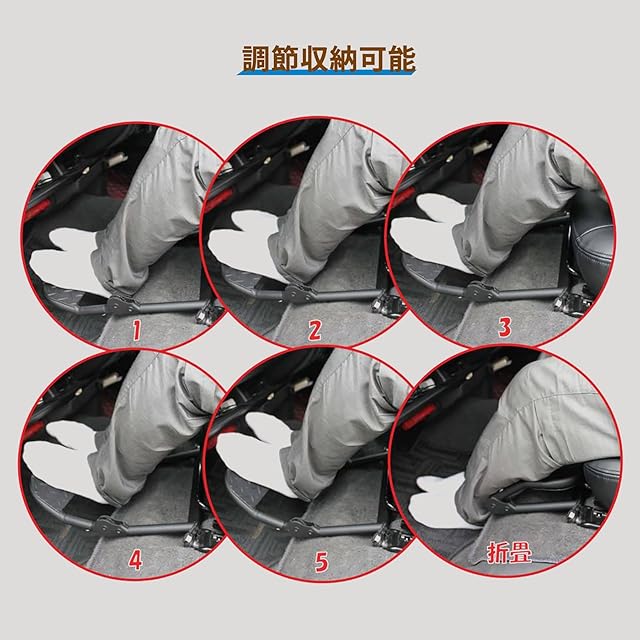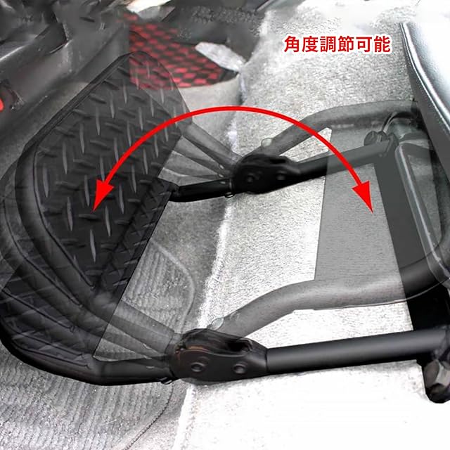 【角度調整可能】折りたたみ式フットレスト、フットレストはラチェットギアになっており、助手席に座ったまま足で押し上げることで高さと角度を調整できます。最も快適な角度を見つけて、最後のレベルは折りたたみ可能です。使いやすく、前席乗員の重心が分散されるので疲れにくく、長距離移動にも便利です。金属製なので鋭利になるため、衣類の汚れ防止と怪我の防止のためにパッドで覆いました。