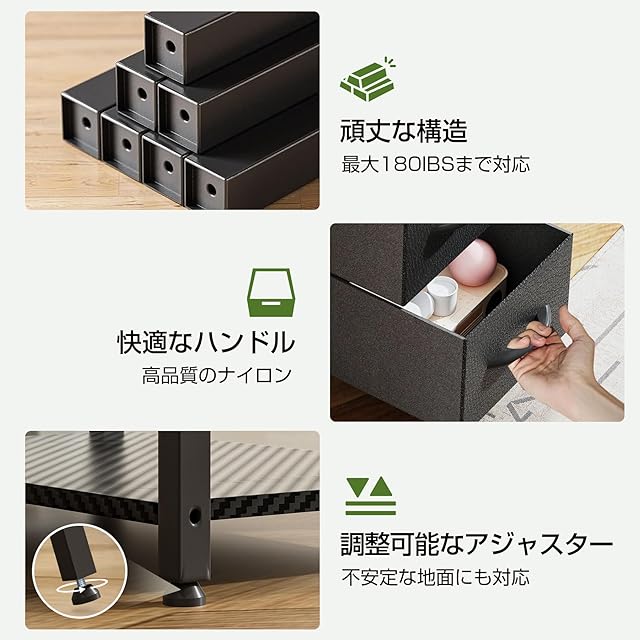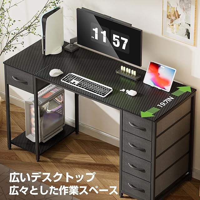 【1台で多用途に対応】「カーボン調」×「引き出し付き」×「大容量スペース」×「アジャスター付き」×「コンパクト」など、デスクに求める全ての魅力がこの1台に集結!パソコンデスク、オフィスデスク、学習机、ゲーミングデスク、ドレッサーとして、多彩な役割をこなし、現代のライフスタイルにフィットします。テレワーク・在宅勤務・書斎・会社用の方にお薦め。