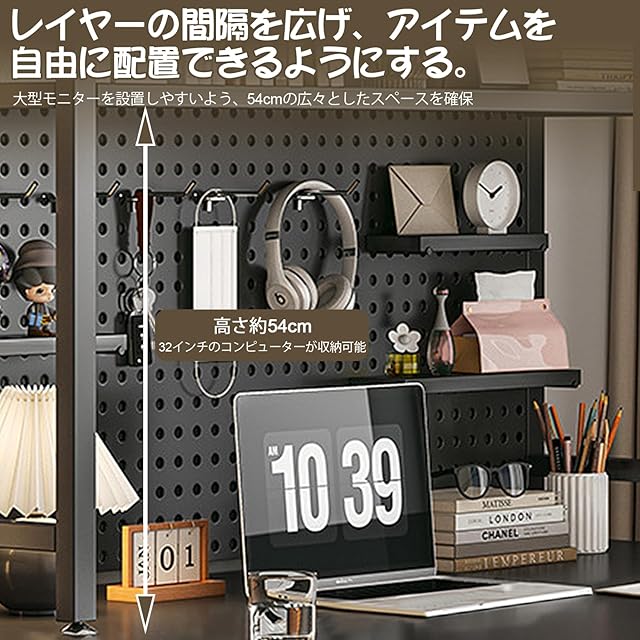 【便利な穴付き板で収納力アップ】孔のついた板部分を活用することで、ヘッドフォンや鍵などの小物を掛けて収納でき、デスク周りを効率的に整理できます。限られたスペースを最大限に活用可能です。