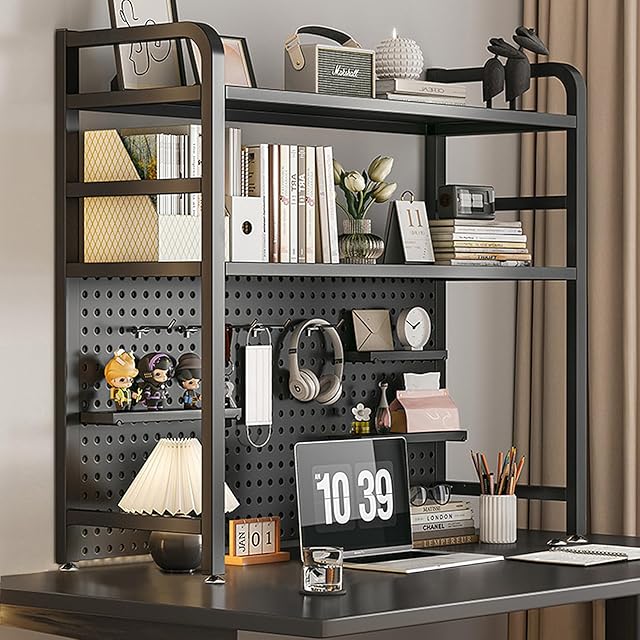 デスク上置き棚 机上ラック 卓上収納ラック 有孔ボード付き 多機能2段ラック 組立式 卓上本棚 デスクトップ収納 鉄製 小物整理 オフィス 学校 事務用品 文房具対応 ブラック/ホワイト (95CM)