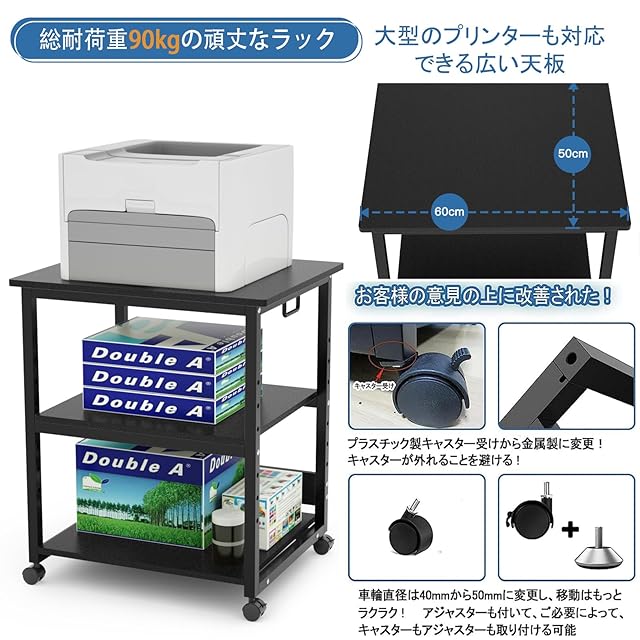 ✅[細部までこだわる] ★プリンタの動作中や、重たい機器を乗せた場合にのグラつきを防ぐバックパネル付き ★前輪はストッパー付きキャスターなので固定やメンテナンス時のちょっとした移動に便利です。 ★取っ手が付いているので移動時に便利です。 ★カラー : フレームカラーも黒で統一した、高級感を感じさせるブラック。現代のライフスタイルにスッと溶け込みます。