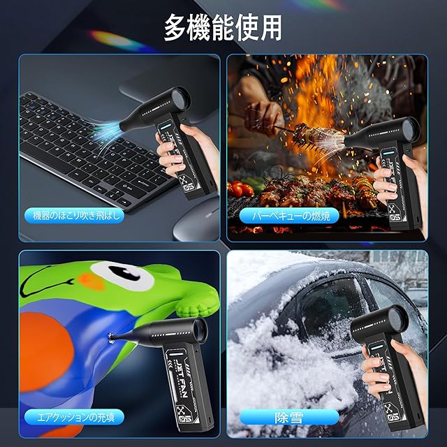 充気ノズル&吹風ノズル:充気ノズルと吹風ノズルの2種類のアクセサリーを備えた電動エアブロワーは、隙間の汚れを簡単に除去でき、カメラレンズ、コンピューター、キーボード、車両、ファン、窓ガラス、エアコンファンなどの家庭用清掃に最適であり、エアマットレスの膨張にも使用できます。