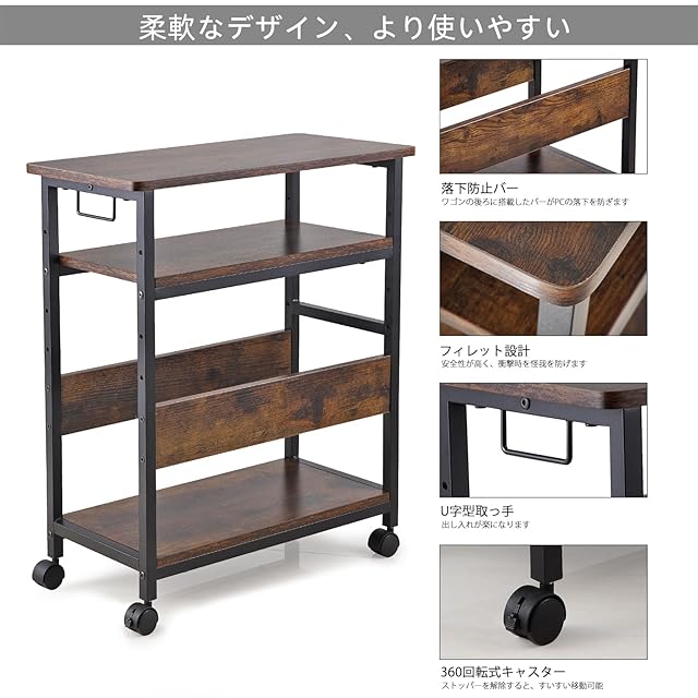 キャスター付き&移動便利 :PCワゴンの下には4個のキャスター付き(2個ロック可能)掃除や移動の時に便利な差し込むだけで簡単に取り付けられるストッパー付きキャスターワゴン。静音型でスムーズに移動可能耐久性に優れ、軽量にも関わらず優れた耐荷重性を持っています。