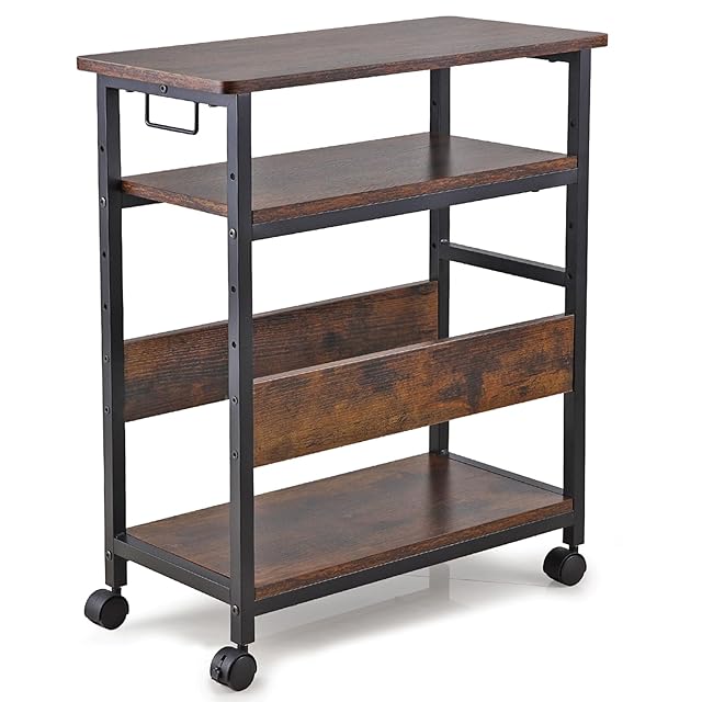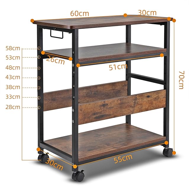 3段収納:pcワゴン、pcラック、プリンター台、サイドテーブルなどとして使用して。中棚の位置は6cmのピッチで8段階の上下調節が可能です。収納する機器や小物のサイズに合わせて変更できます。天板にプリンターがしっかりと置けます、下段にPCケース、中段にPS5を横置きで収納できます。