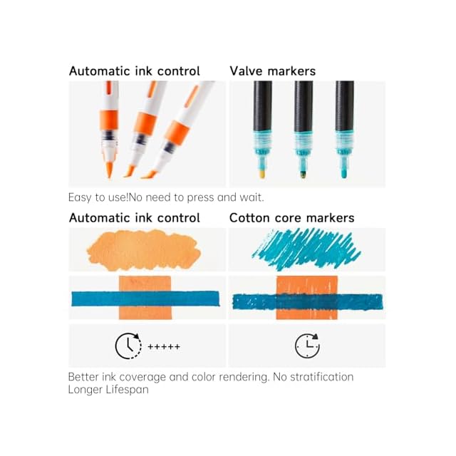 【直液式タイプ】適量のインクを供給できる構造によって、キャップを外して、優しく振るとインクがスムーズに流れます。より明るい色とより強いカバレッジになり、 面倒な起動手順は不要で使いやすいです。水性インクで、速乾性に優れ、色褪せしにくいです。安全無臭なので大人からお子様まで安心してお使いいただけます。USA品質安全規格ASTM D- 4236とEN71-3基準も適合しています。◎ご使用中以外はペンが乾くのを防止するため、キャップをお閉めください。