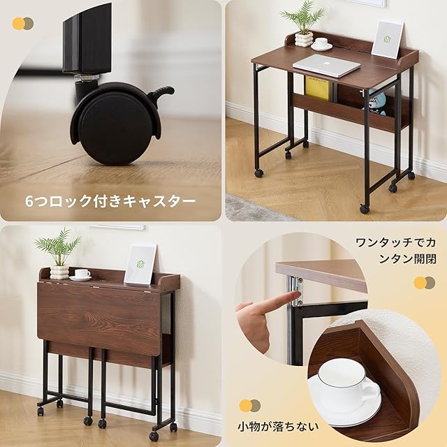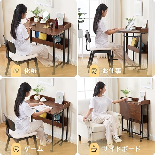 【高機能折り畳み式デスク】天板下のボタンを押すだけで、簡単に折り畳むことができます。インテリアを置く物置や、ドレッサー、キッチンでのサイドテーブルとしても活用可能。オフィスや、作業台、子供用の勉強机、在宅ワークなど多目的用途で使用できます。