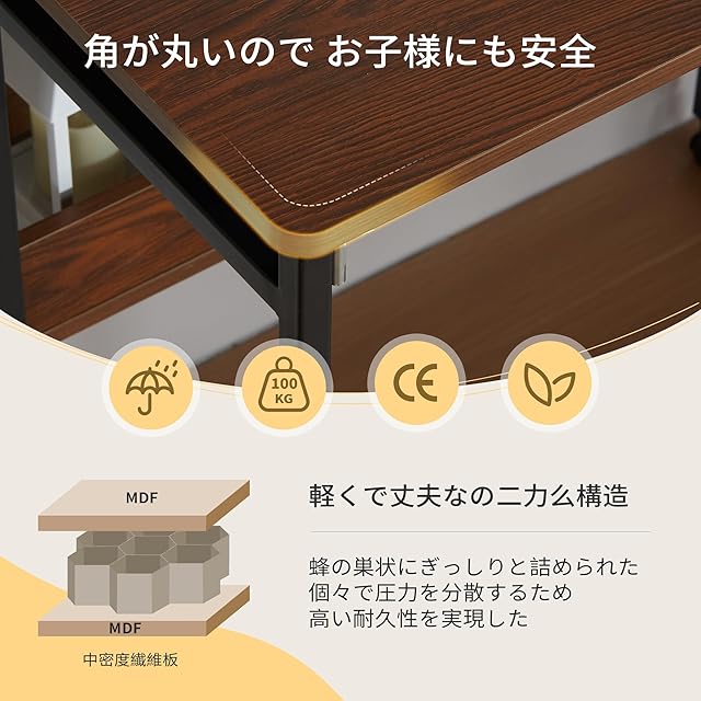 【高強度メラミン加工】メラミンで表面を加工し、水や汚れ、傷に強く、汚れた時もサッと簡単に拭くことができお手入れも簡単です。パーティクルボードを使用しているため、耐久性を保ちつつ軽量化を実現しました。