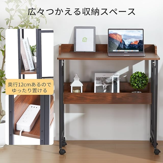 KITHOME パソコンデスク 折りたたみデスク キャスター付き 幅85 奥行53 高さ80cm 省スペース テレワーク 多機能テーブル 机 コンパクト 頑丈で組立簡単 メラミン加工 一人暮らし 2枚フック付き 木製 モニターアーム取付対応 ブラウンウォルナット 黒