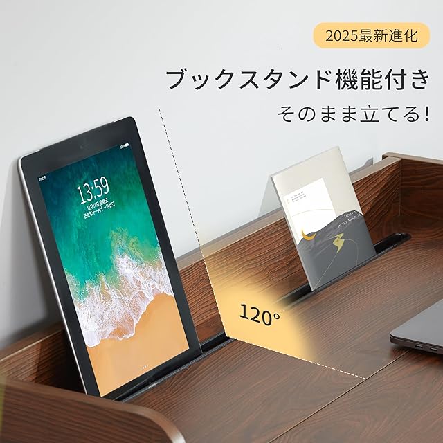 【そのままブックスタンド機能付き】天板上に二つの”一”字型の穴がついております。タブレットをそのまま立てることができて、大き目のサイズで分厚くて高い本や雑誌などの書類でもしっかり支えられ、倒れません。作業や食卓として最適なデスクです。