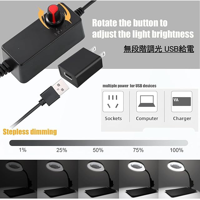 【省エネ・幅広い用途】USBポートに簡単に接続でき、家庭用コンセントで電源供給しています。また48個高輝度のLEDを備えた、消費電力は12Wで、普通のライトと比較して1/4の電力を消費しかない、約50,000時間の使用寿命を持ち、節電・省エネです。この拡大鏡ランプは、小さな部品の確認、本の読み取り、はんだ付け、モデルの作成、縫製などに役立ちます。老化した目がある人は、新聞を読むことができる。閲読室、オフィス、芸術工房、建築設計室など場所に適用します。