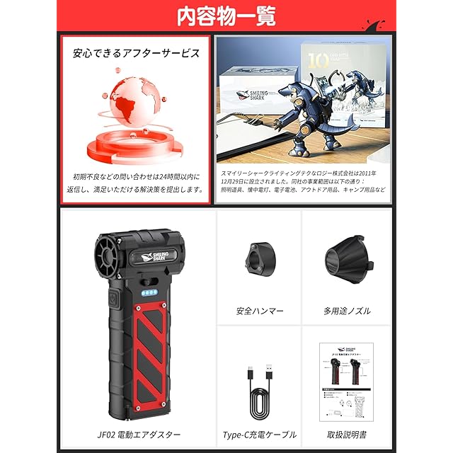 Smiling Shark 電動エアダスター JF02,【8000mAh大容量バッテリー&緊急対応セット】超強力エアダスター 110000RPM 無段階風量調整 吹き出し/吸い込み 8000mAh 長時間連続使用 安全ハンマー&シートベルトカッター付き Type-C充電式 残量表示 小型 持ち運び便利 多用途(パソコン/キーボード/車内/エアコン/掃除用等) 日本語取扱説明書付き ブラック